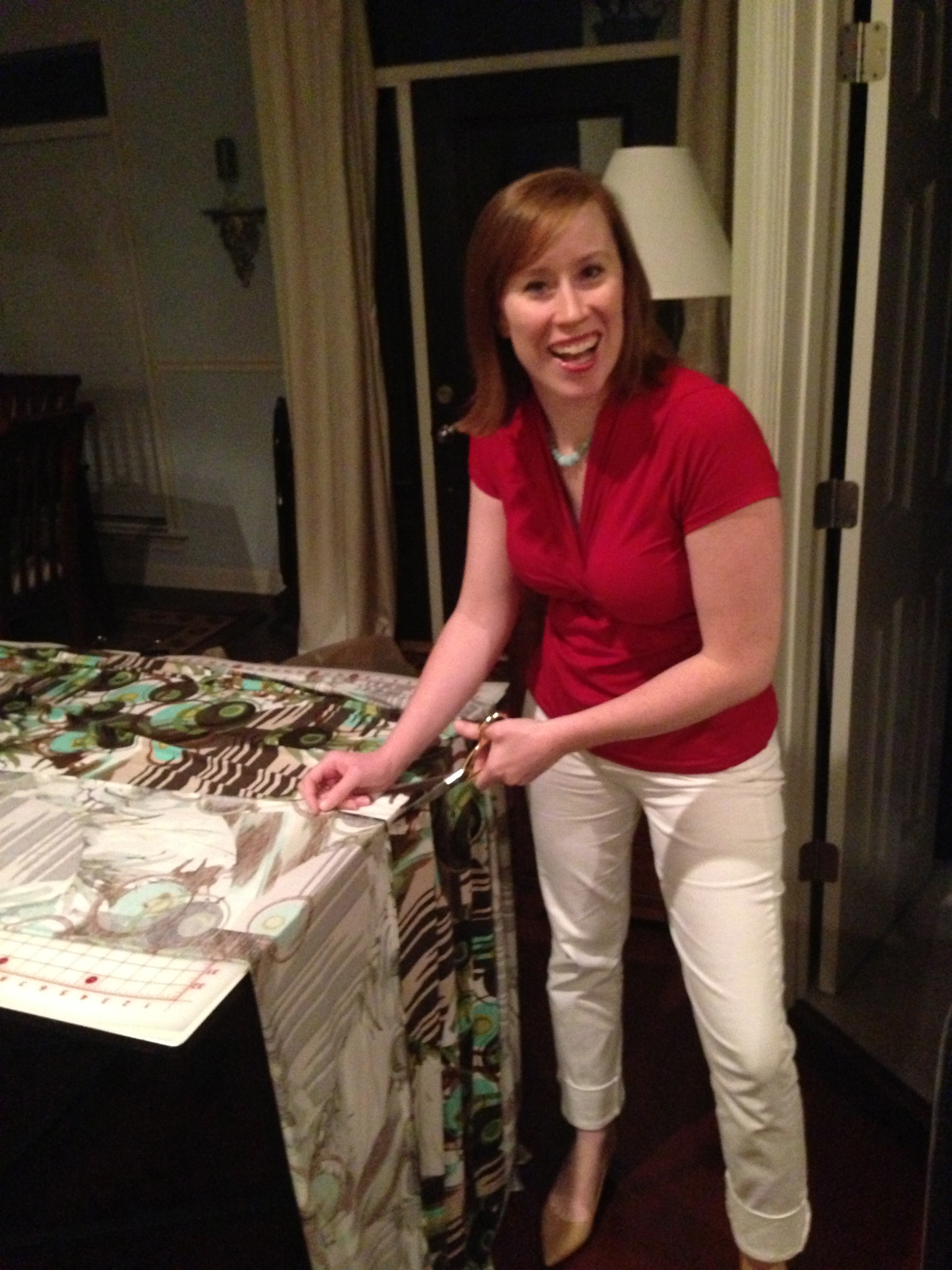 May 28 (Tuesday) — Back to the real world. Here’s my version of Sandra’s pattern, Vogue 1291. Although this photo was taken during the workshop when I tried on my completed top (notice the mismatched necklace), I actually wore it to work the next day with a cobalt blue pencil skirt and my coral Cole Haan peep toe wedges but I just couldn’t get a flattering photo that I could bring myself to post for all the world to (potentially) see. Sorry 😦