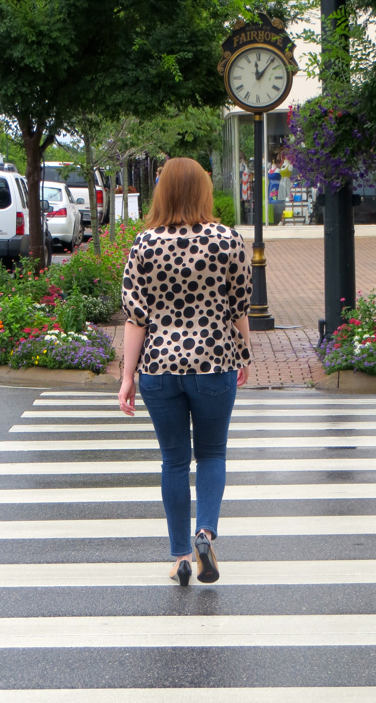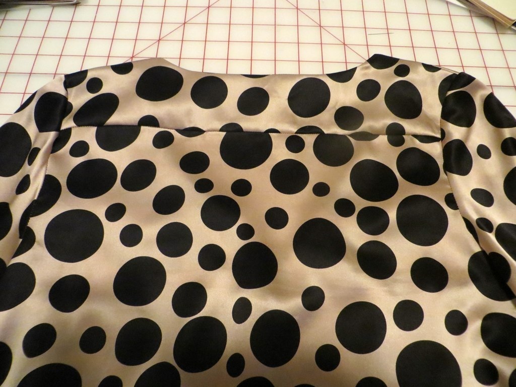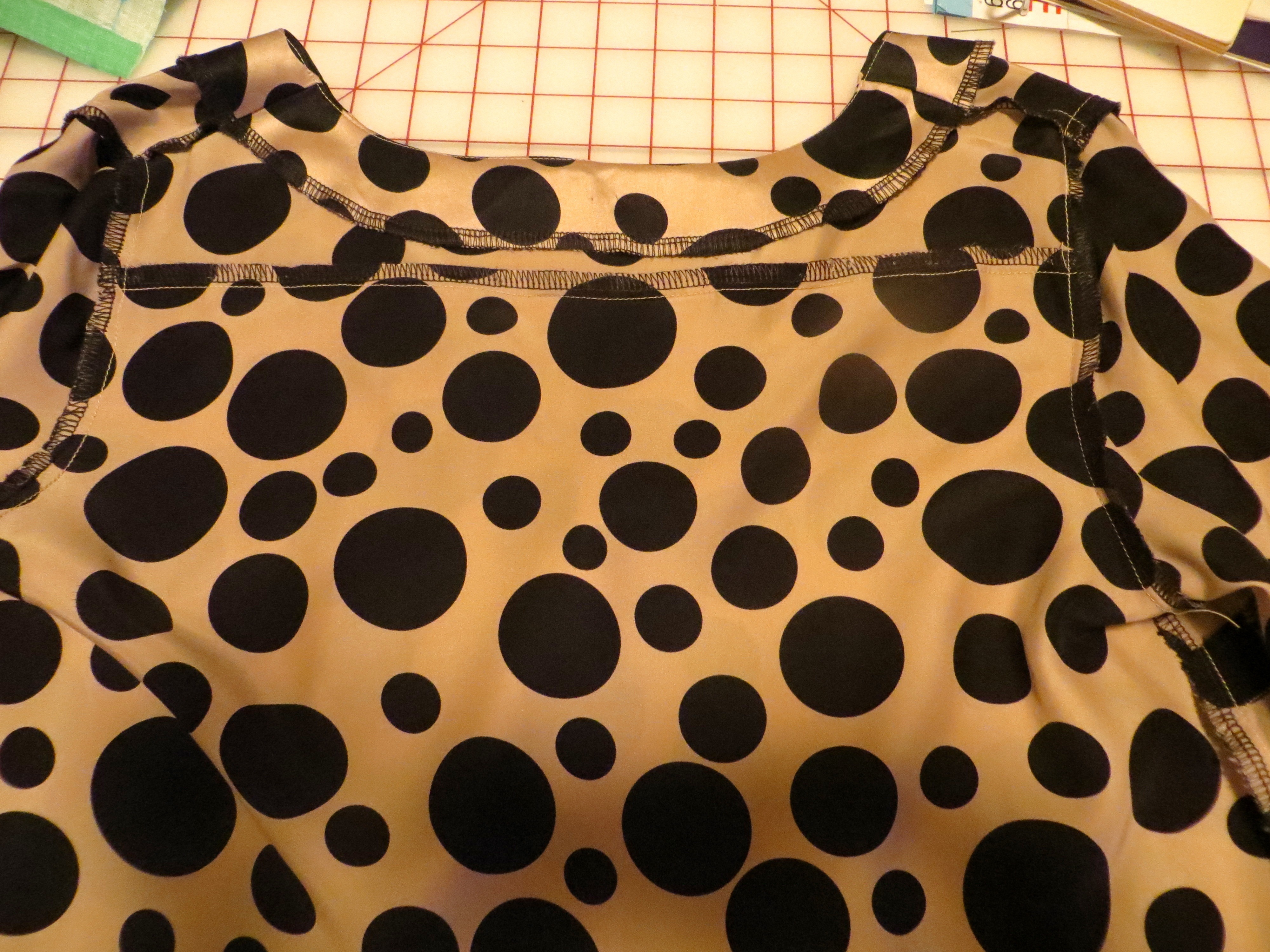 I pulled a fabric from my stash for this top — a luscious tan silk charmeuse with black polka dots of varying sizes. I picked up two yards of this dreamy fabric two years ago in Atlanta at Gail K’s. I can’t tell you how important it is to use a drapey fabric for this pattern. I considered using a cotton lawn but that would have been a disaster. You really want something that floats and moves around your body. And if you enjoy petting it because it feels so good, that’s an added bonus 🙂