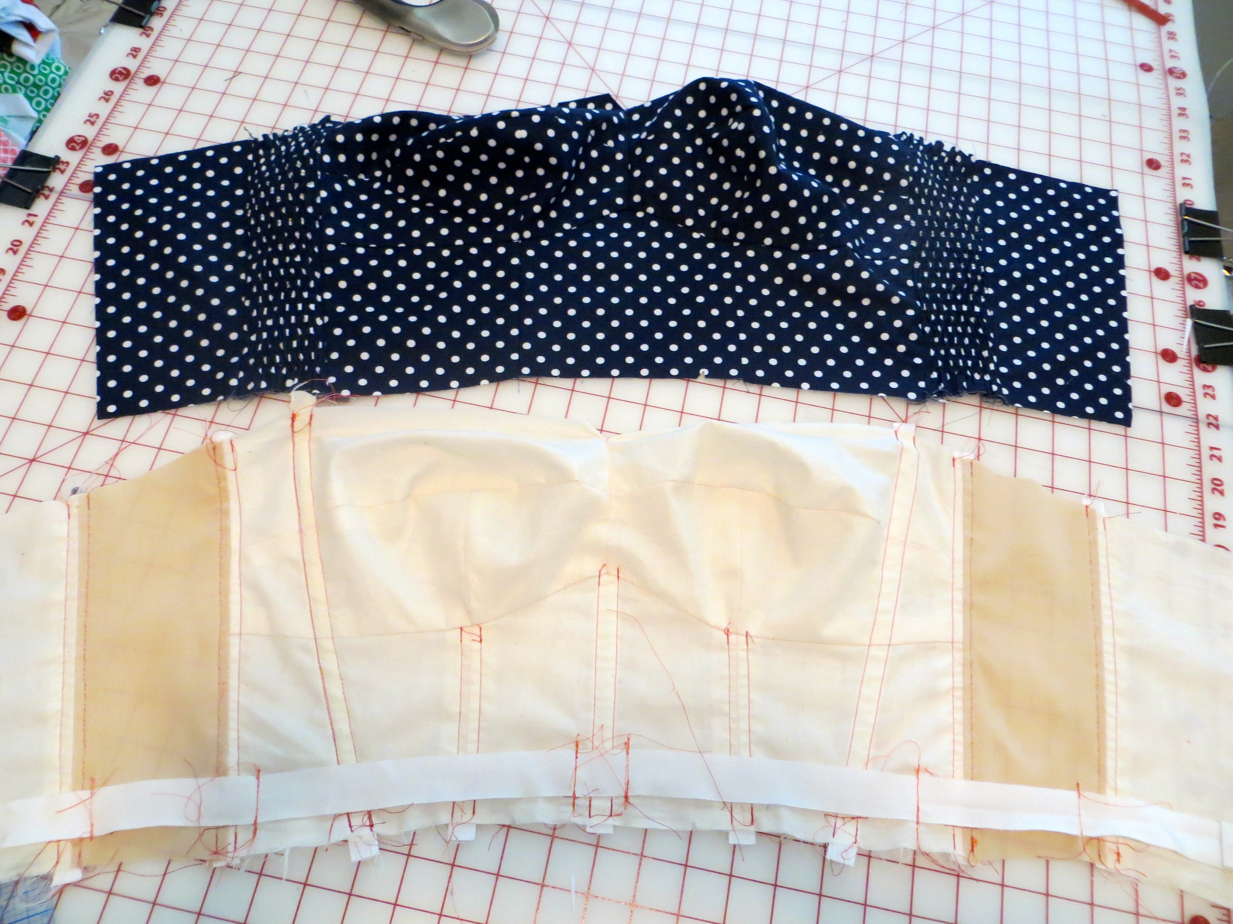 During the earlier muslins, I duct taped cheap boning from Hancock Fabrics into place for fitting but on the final version, I went ahead and sewed my boning channels and added the spiral steel boning. Next time, I think I will lengthen this layer to my high hip (like a corselet) for added wearing comfort. As it is now, the boning ends right at my narrowest point, somewhat cutting into my body when I sit, and also making the skirt portion just below the waist seam blouse out a little bit.