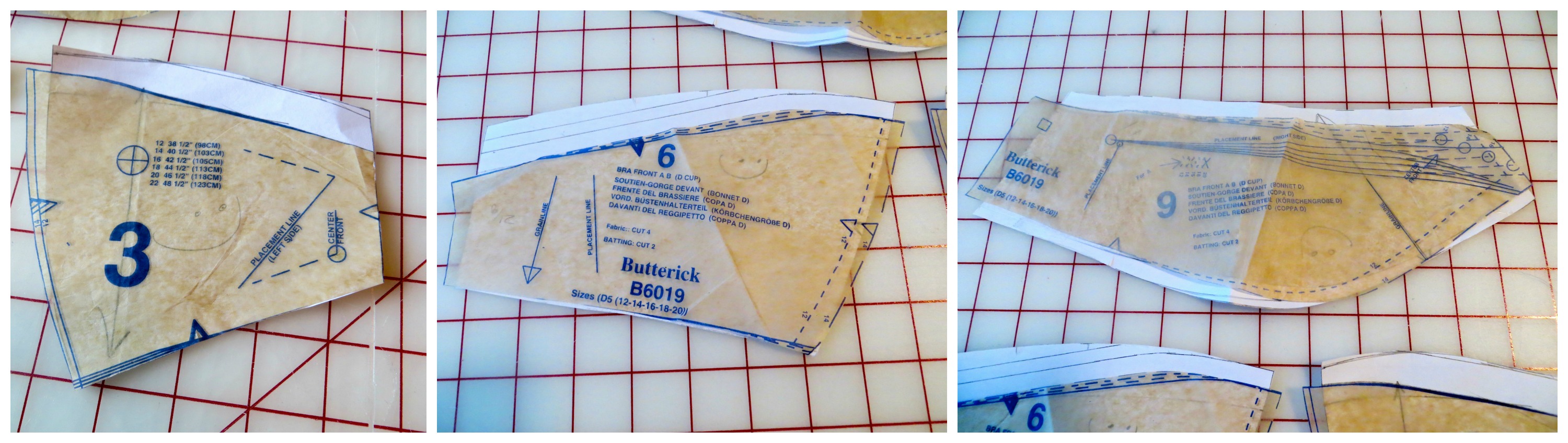 You can hopefully see in this photo how my final pattern pieces in white paper compare to the original pattern pieces.