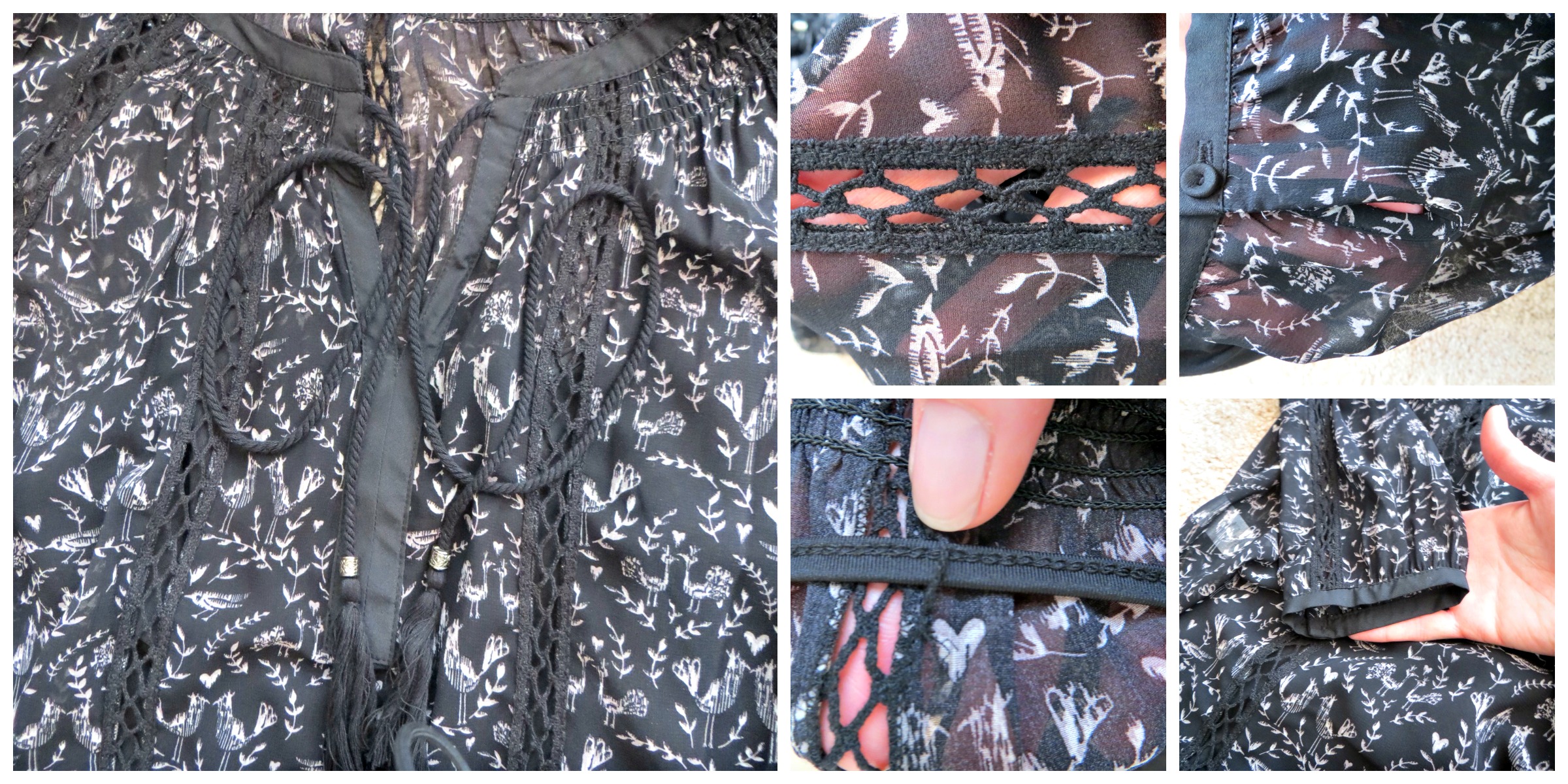 The seams feature faggoting or entredeux which adds visual interest and texture. The interior seams are serged and sewn flat to the trim. The neckline features shirring with elastic thread and is finished with a placket and closed with yarn tassels. The sleeves have a simple placket and button closure.