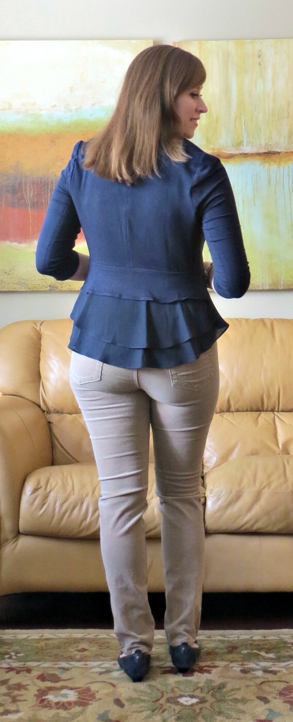 The neckline is safe for work and the hem is a nice length for wearing tucked in or out. The blouse fits well through the bust but is a tad low in the armscye. This minor fitting issue was not a deal breaker, though, and I think this blouse will fit nicely as a multipurpose basic in my wardrobe. It has tucks sewn at the shoulders for bust shaping and no side darts for a loose, flowy fit.