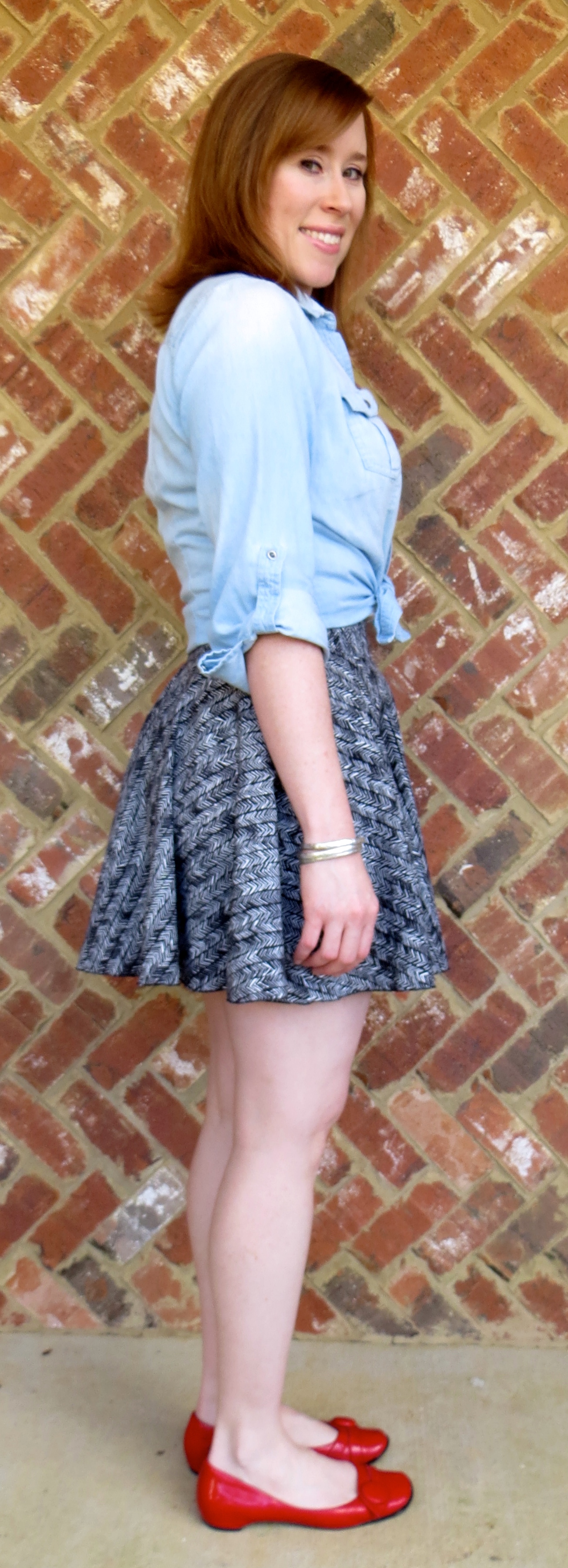 But as more and more versions popped up across the interwebs, the ingenious design started to grow on me and I gave in. For those of you not familiar with this pattern, it appears to be a cute circle skirt but it has pleats in the front and back that disguise the shorts aspect of the garment. Really cool if you ask me!