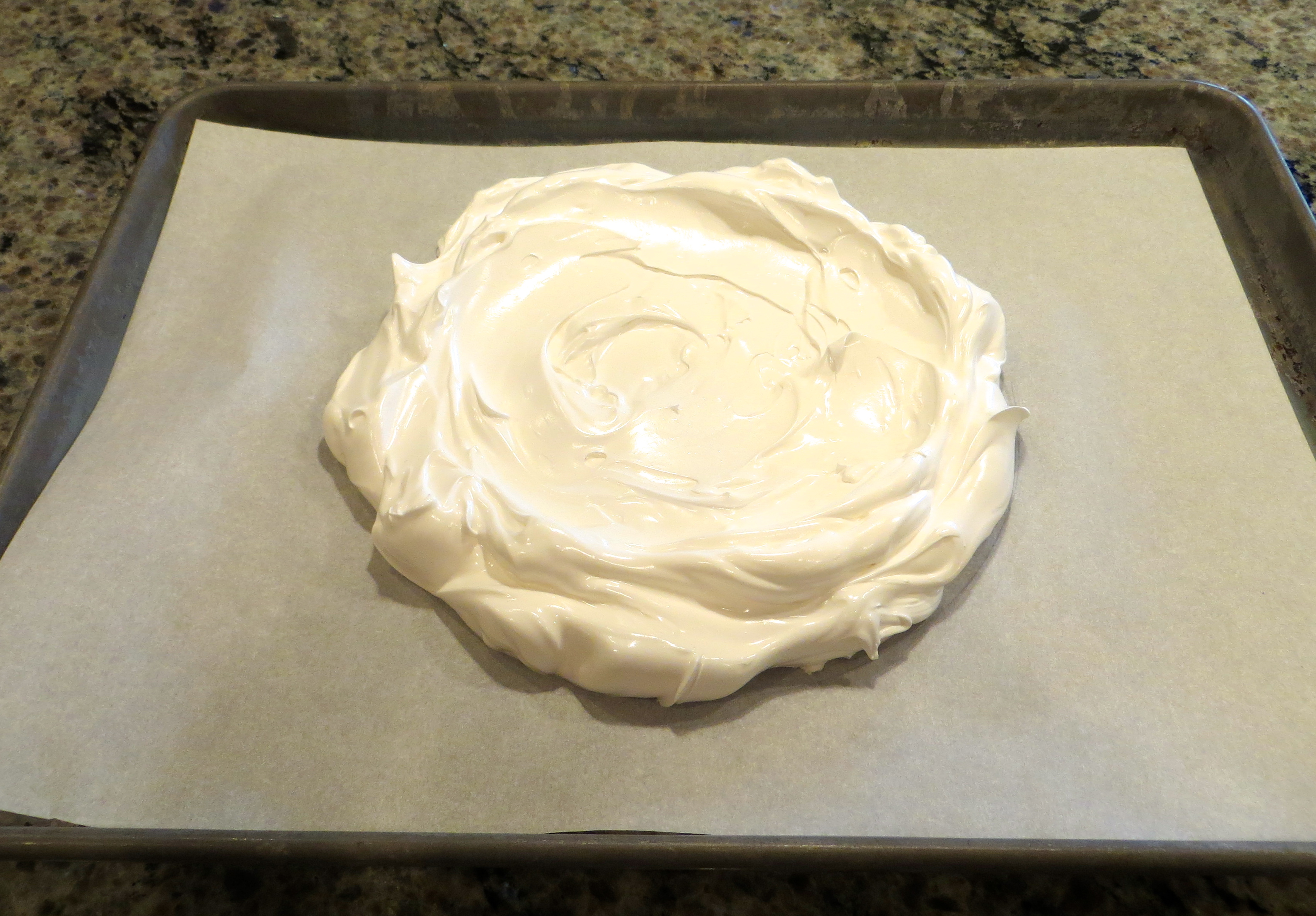 For the large pie, trace a 9″ circle onto parchment paper, flip the paper over and place it on a baking tray, then spread the meringue on top.  Use the spoon to spread it into the circle and smooth the top with the wet spoon.