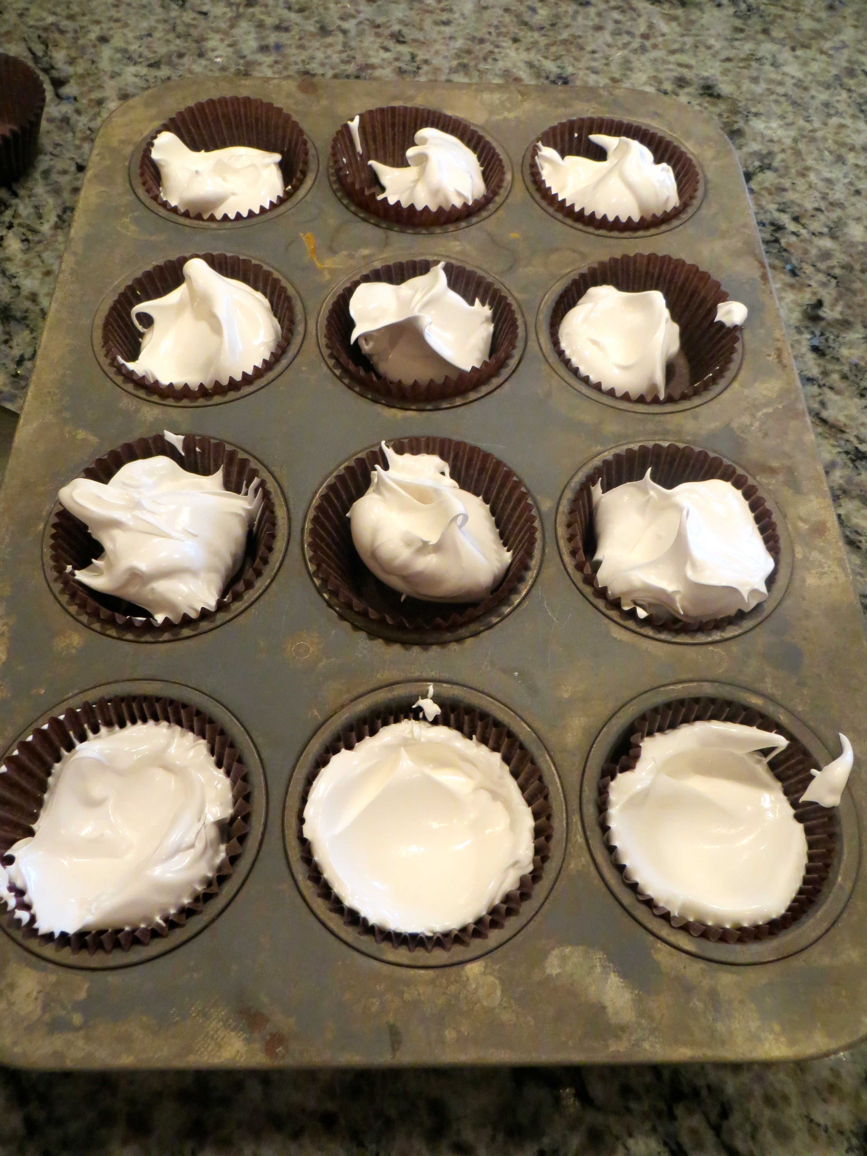 If you choose to make the cupcakes, one batch makes about 2 dozen regular size cupcakes.  This time around I just used a spoon to fill the paper cups then smoothed the tops with a wet metal tablespoon (this is a great kitchen trick for meringue).  If I am being fancy, I will use my piping tools to make mini meringue nests on parchment and forego the cupcake papers and tin.